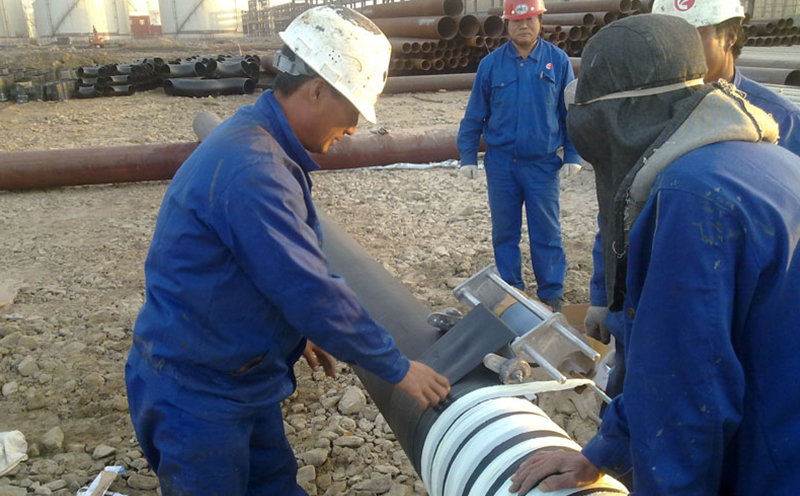3、底漆涂刷5-10分鐘表干后即可纏帶。施工過程中要增大厚膠型聚乙烯膠粘帶的平衡漲力,達到緊貼于作業面,實現包平無空隙、無皺折效果。